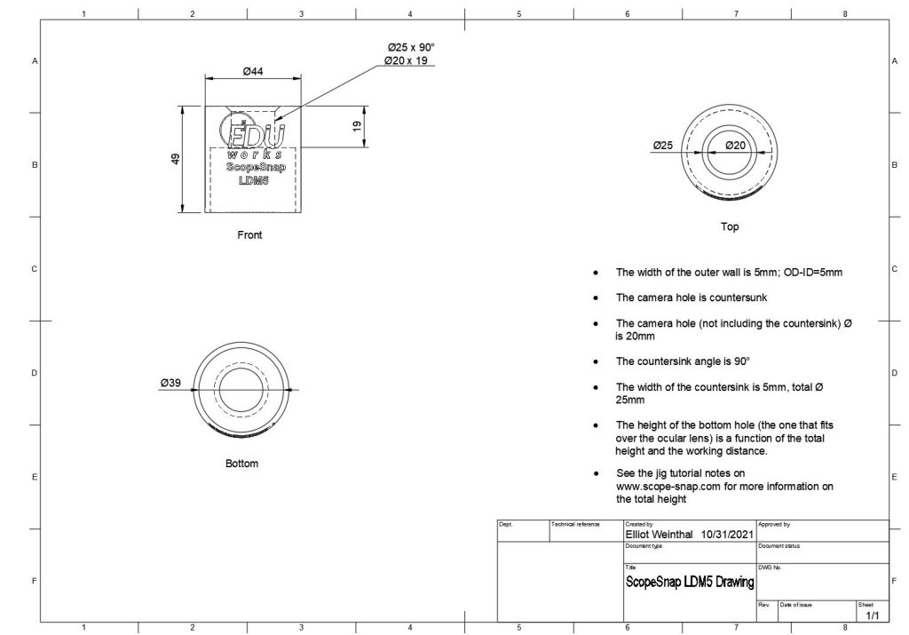 ScopeSnap by Elliot Weinthal is licensed under a Creative Commons Attribution-NonCommercial-ShareAlike 4.0 International License. You may reproduce and/or modify for non commercial use only – I simply ask that if you create a ScopeSnap to support a new microscope model that you send me the model name and dimensions so that I can create an STL file and load it here for others to use. To use the jigs, you must print both the diameter sleeves and working distance spacers. The diameter sleeves are used to find the diameter of the ocular lens; while you can use a caliper to determine this, I have found that printing them proves more accurate due to printer tolerances. I also noticed that when printing the sleeves, the side that comes from the print bed has a small lip which will interfere with testing and provide an inaccurate diameter measurement – make sure you slide the side of the sleeve that doesn’t have the lip on first to determine proper diameter size. Once you find the correct diameter, just write down the size of that sleeve – I recommend writing the sleeve size on the sleeves after you print, it will be difficult to tell them apart without a caliper. The spacers are used to determine the working distance of the microscope, simply hold them on the ocular lens (with the grommet removed) and use your device with the spacer to determine which size provides the best image quality and write down the spacer size. The next dimension you will need is the total height of the ScopeSnap; if the ScopeSnap is too tall, it will interfere with the diopter adjustment or head. With that said, the height must be tall enough so that the ScopeSnap stays on the ocular lens without falling off, you can use the sleeves to have the device fit over the diopter adjustment if the lens itself is too short. Once you have these parameters, you can replace the OD, ID, working distance, and total height of the drawing below to create your own!